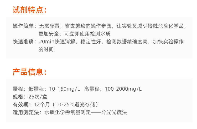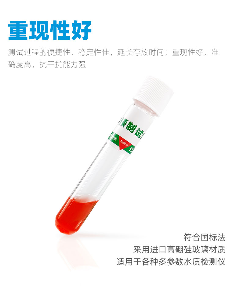 測試過程的便捷性、穩定性佳,延長存放時間;重現性好,準確度高,抗干擾能力強,采用進口高硼硅玻璃材質適用于各種多參數水質檢測儀,作為綠色試劑,減少接觸化學危險品的機會,確保操作人員的身體健康