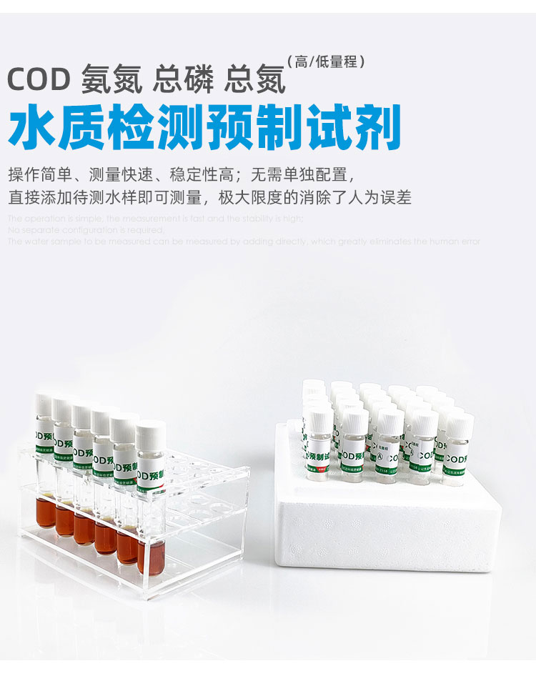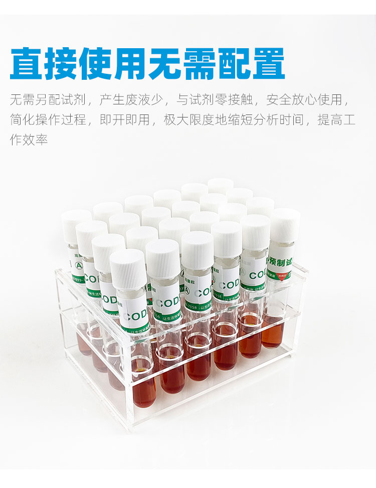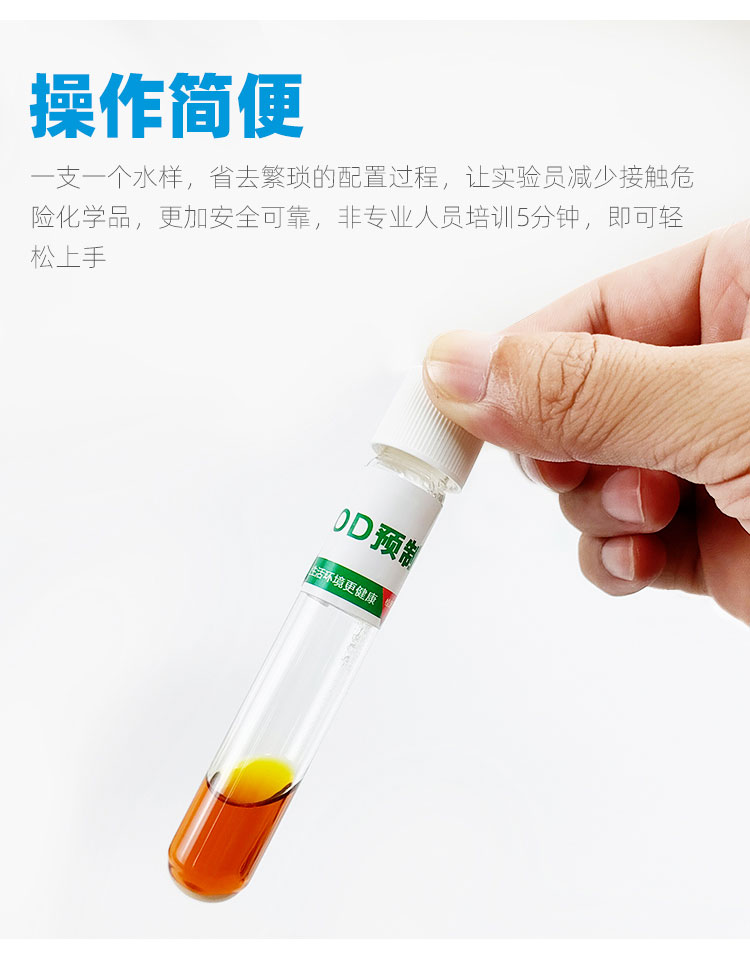 一支一個水樣,省去繁瑣的配置過程,讓實驗員減少接觸危險化學品,更加安全可靠,非專業人員培訓5分鐘,即可輕松上手